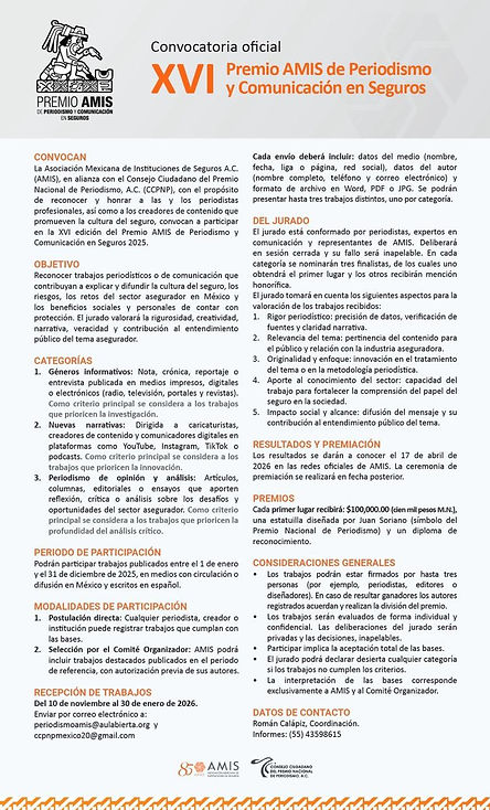 La Asociación Mexicana de Instituciones de Seguros A.C. (AMIS), en alianza con el Consejo Ciudadano del Premio Nacional de Periodismo, A.C. (CCPNP), con el propósito de reconocer y honrar a las y los periodistas profesionales, así como a los creadores de contenido que promueven la cultura del seguro, convocan a participar en la XVI edición del Premio AMIS de Periodismo y Comunicación en Seguros 2025.